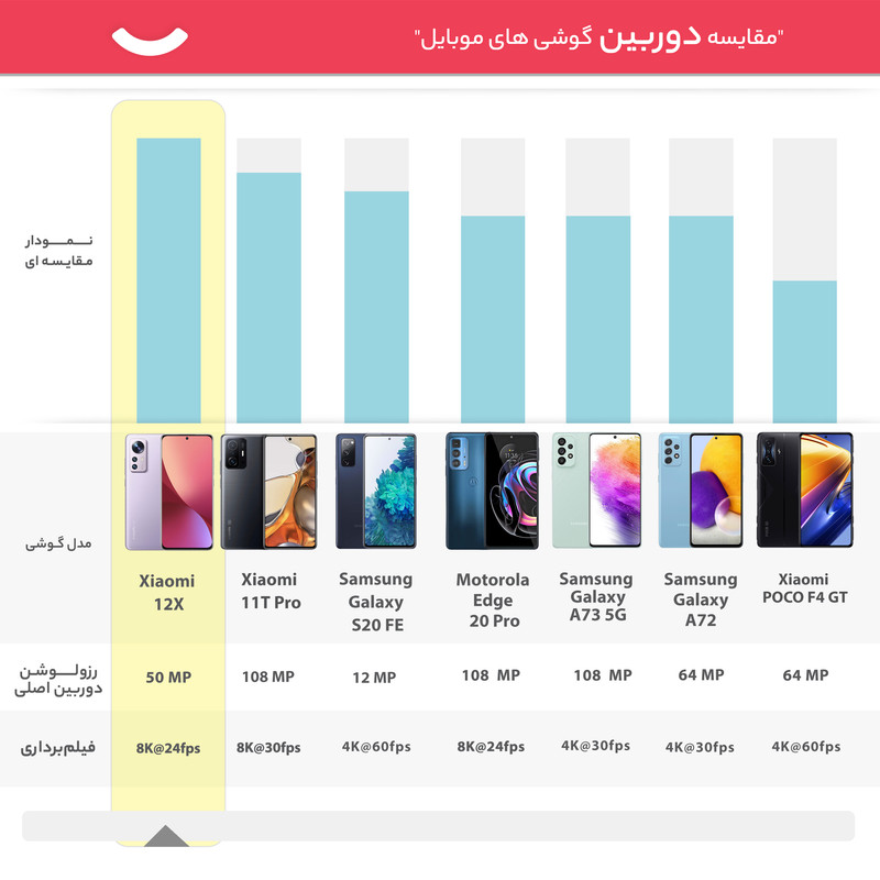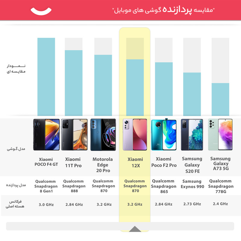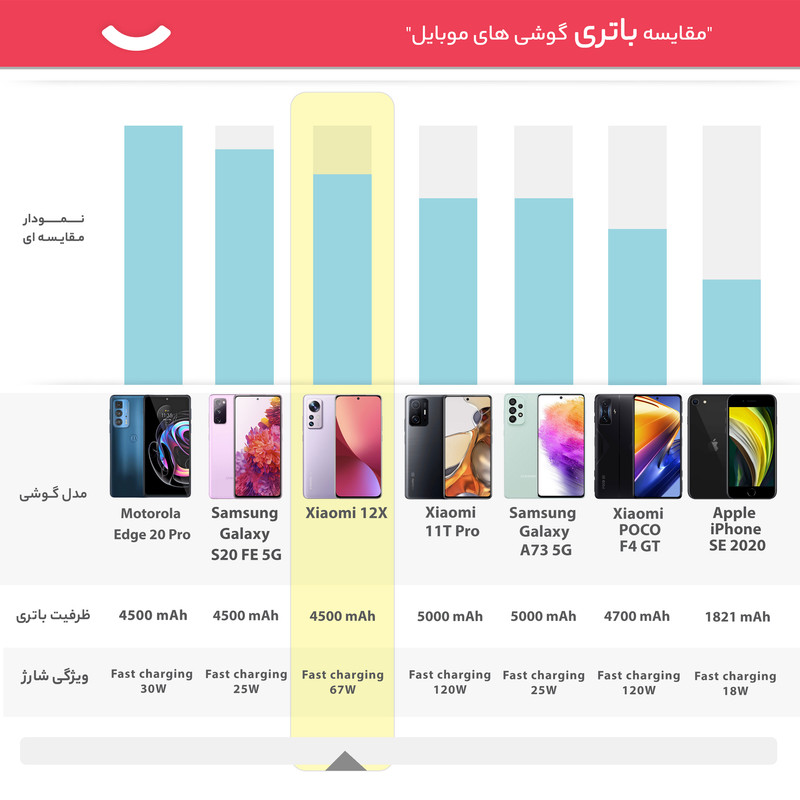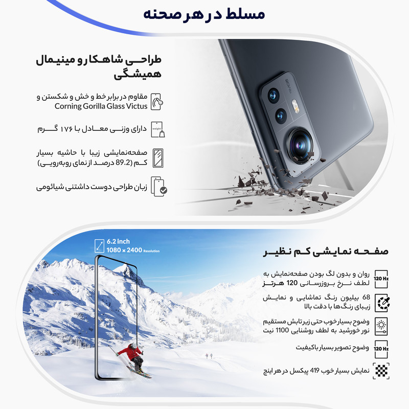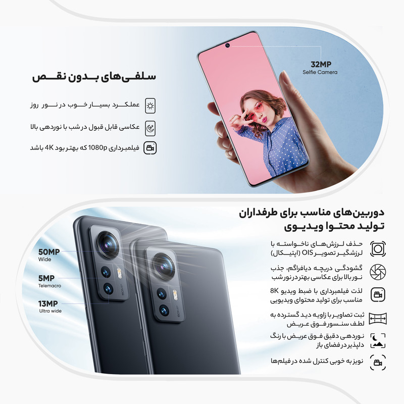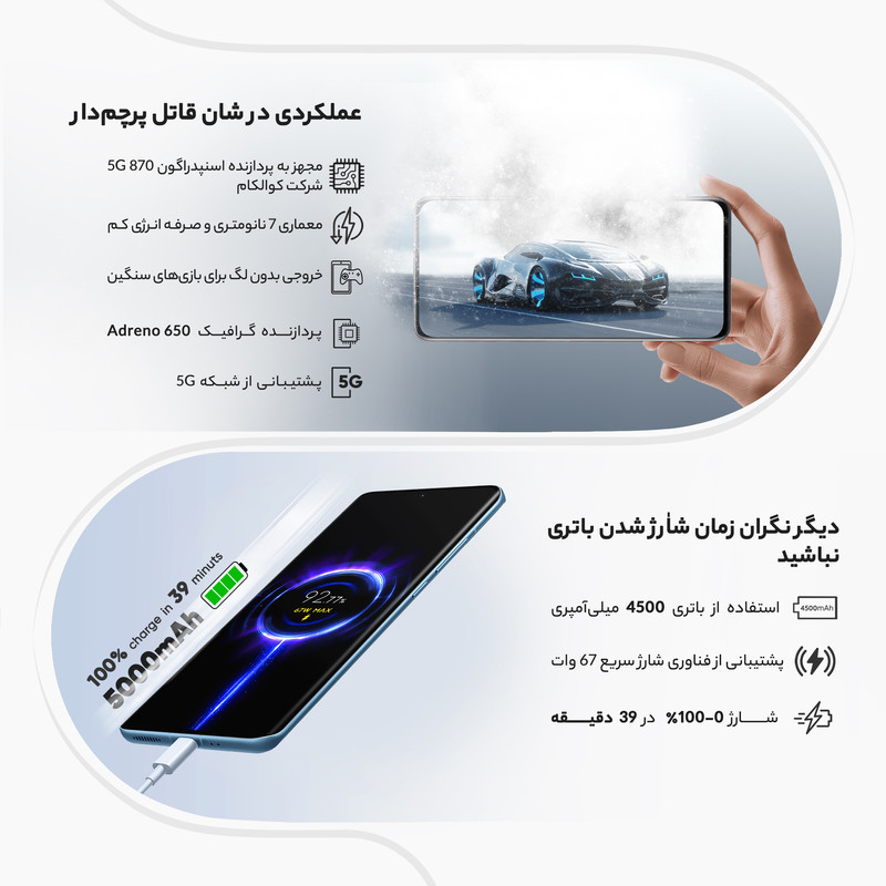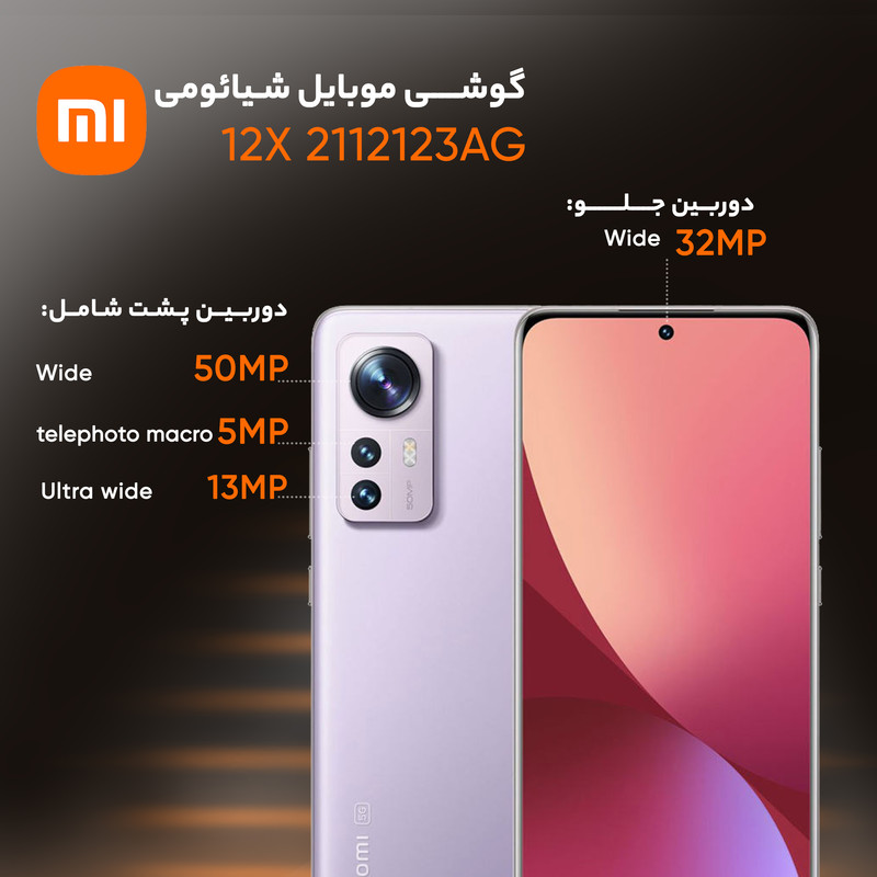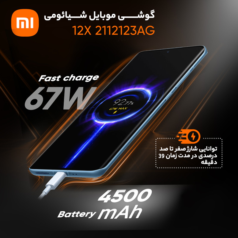 شیائومی 12X 2112123AG یکی از گوشیهای هوشمند باکیفیت این شرکت چینی است که به لطف بهره بردن از مشخصات فنی مناسب و قدرتمند، توانایی ارائه عملکرد بسیار خوبی را دارد. در همان نگاه اول شاهدطراحی پرچمدارگونه و جذابی هستیم که برای این گوشی در نظر گرفته شده است. شیائومی 12X 2112123AG به صفحهنمایش با ابعاد 6.28 اینچ و رزولوشن 1080×2400 پیکسل از نوع امولد مجهز شده است. صفحهنمایش بسیار باکیفیتی که توانایی نمایش 419 پیکسل در هر اینچ و نرخ بروزرسانی 120 هرتز را دارد. حداکثر روشنایی 1100 نیت (شمع در متر مربع)، سبب شده تا در شرایط نوری متنوع، وضوح تصویر بسیار خوبی را از این صفحهنمایش شاهد باشید. یک سنسور دوربین اصلی با رزولوشن 50 مگاپیکسل از نوع عریض (wide) در کنار سنسور 13 مگاپیکسل از نوع فوق عریض (ultrawide) و سنسور 5 مگاپیکسل ار نوع تلهفوتو ماکرو، سنسورهای دروبین سهگانه قسمت پشتی این گوشی هوشمند را تشکیل میدهند. بریدگی دایرهای شکل ناچ در قسمت بالایی و مرکزی صفحهنمایش هم، سنسور دوربین سلفی با رزولوشن 32 مگاپیکسل را در خود جای داده است. حضور پردازنده قدرتمند اسنپدراگون 870 5G شرکت کوالکام سبب شده تا شیائومی 12X 2112123AG توانایی ارائه عملکرد بسیار خوبی را در اجرای بازیهای سنگین (مثل کالآفدیوتی موبایل) و برنامههای کاربردی و محبوب داشته باشد. باتری با میزان ظرفیت 4500 میلیآمپرساعت و توانایی شارژ سریع با توان 67 وات، از دیگر مشخصات در نظر گرفته شده برای این گوشی هوشمند هستند. لازم به ذکر است که امکان شارژ سریع با توان 67 وات سبب شده در مدت زمان کوتاه 39 دقیقه، باتری این گوشی بهصورت کامل شارژ شود.