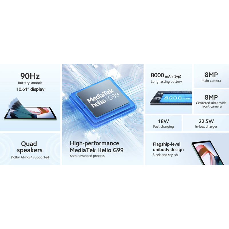 تبلتهای میانرده بسیار مناسب آن دسته از کاربرانی هستند که میخواهند با هزینه کمتر تبلتی را خریداری کنند که به مشخصات فنی مناسب و قابل قبولی مجهز شده باشد. تبلت شیائومی Redmi Pad هم یکی از این محصولات است. این تبلت به صفحهنمایش با ابعاد 10.61 اینچ و رزولوشن 1200×2000 پیکسل از نوع IPS مجهز شده که از جمله قابلیتهای قدرتمند این صفحهنمایش میتوانیم به نرخ بروزرسانی 90 هرتز و حداکثر روشنایی 400 نیت (nits) آن اشاره کرد که در نهایت با صفحهنمایش روان و البته به نسبت روشنی در شرایط نوری متنوع روبهرو هستید. در قسمت پشتی یک سنسور دوربین عریض با رزولوشن 8 مگاپیکسل برای این گوشی در نظر گرفته شده و سنسور دوربین سلفی 8 مگاپیکسل از نوع فوق عریض یا همان ultrawide هم این گوشی را همراه میکند که برای ثبت تصاویر در نور روز و برقراری تماسهای تصویری عملکرد بسیار خوبی دارد. حضور پردازنده هلیو G99 شرکت مدیاتک هم سبب شده تا Redmi Pad در اجرای نرمافزارهای کاربردی و بازیهای محبوب، عملکرد کاملا قابل قبولی داشته باشد. باتری با میزان ظرفیت 8000 میلیآمپرساعت هم از دیگر مشخصات در نظر گرفته شده است. در مجموع باید بگوییم که Redmi Pad در جایگاه یک تبلت میانرده به مشخصات فنی بسیار خوب و قابل قبول و البته طراحی بسیار جذاب و کاربرپسندی بهره برده است. لازم به ذکر است که این تبلت به همراه کیف و محافظ صفحه نمایش در اختیار خریداران قرار خواهد گرفت.